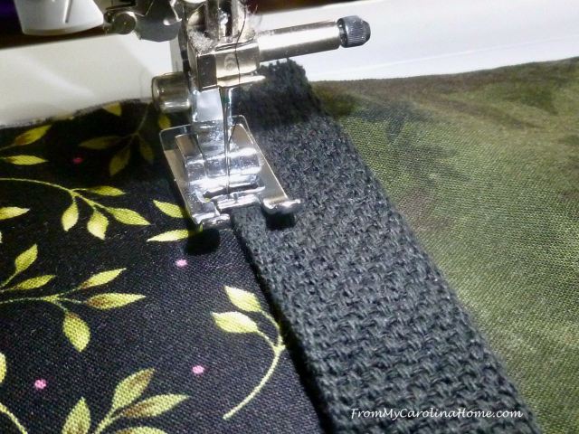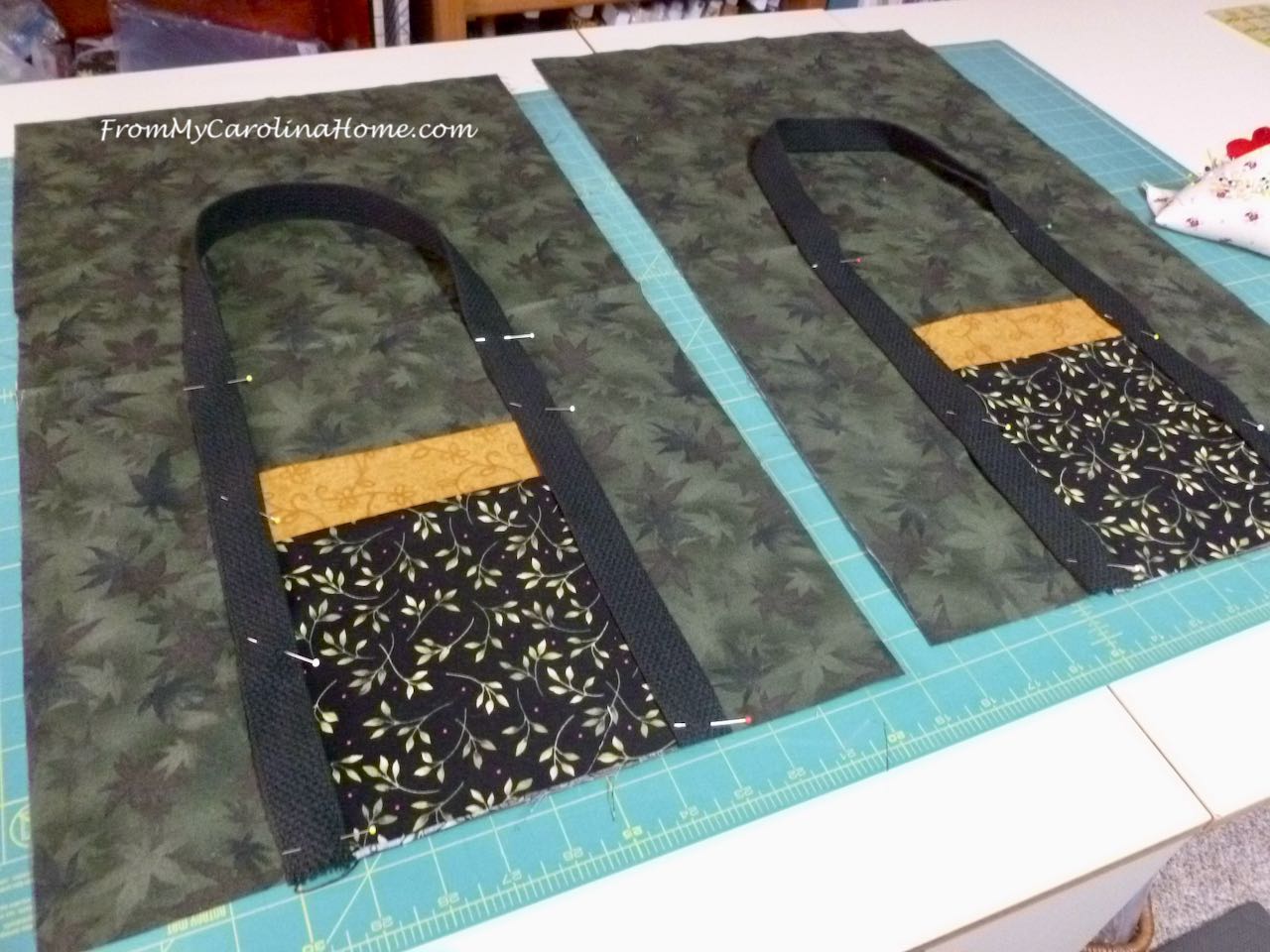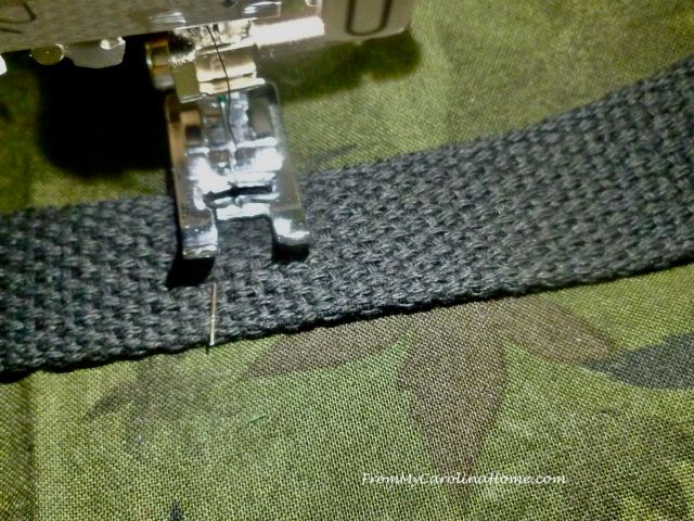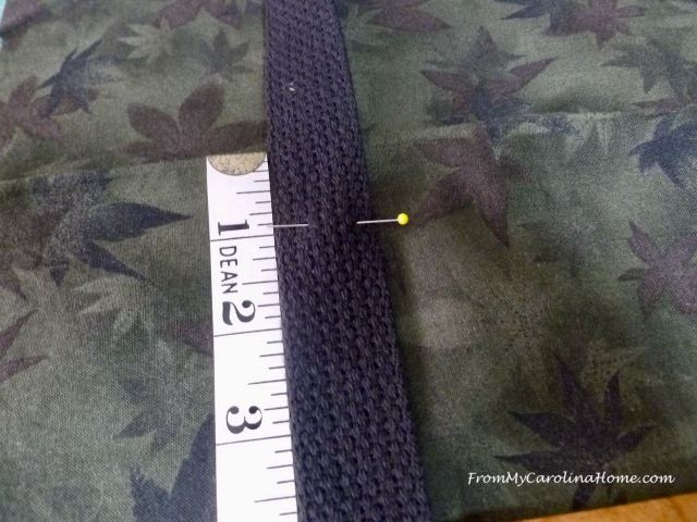 Using one of the handle webbing lengths, center the webbing over the raw edges of the pocket sides, and pin to the base going up to one inch below the pressed fold on the base.