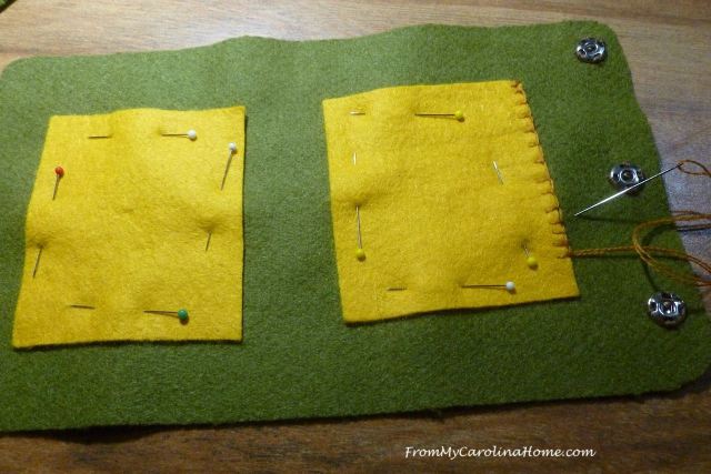 Next, on the right edge of the top wool piece, sew three snaps. Sew the other side of the snap in position on the second lining wool piece at the edge.