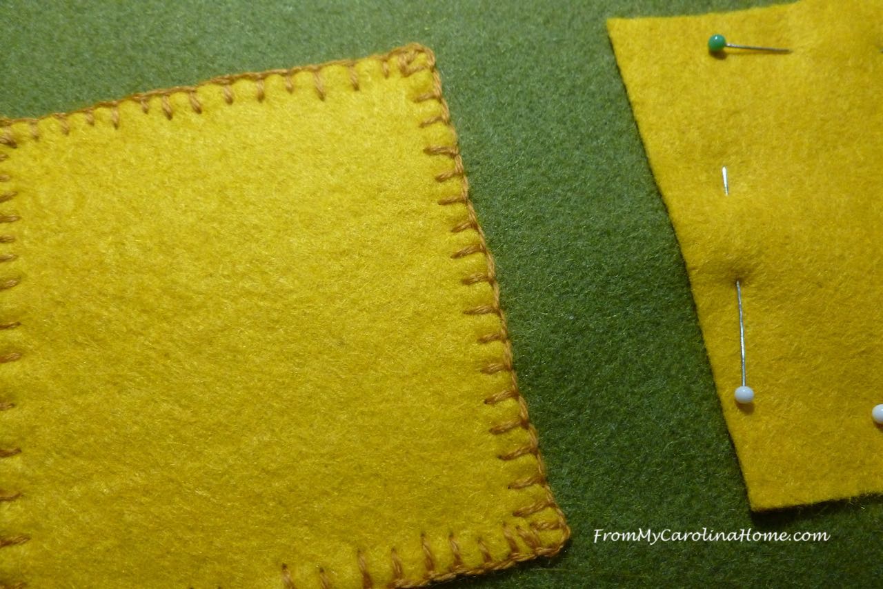 On the lining side, blanket stitch two squares to hold your needles. Place them between the mid-point and the edge, at least one inch in from the short edges.