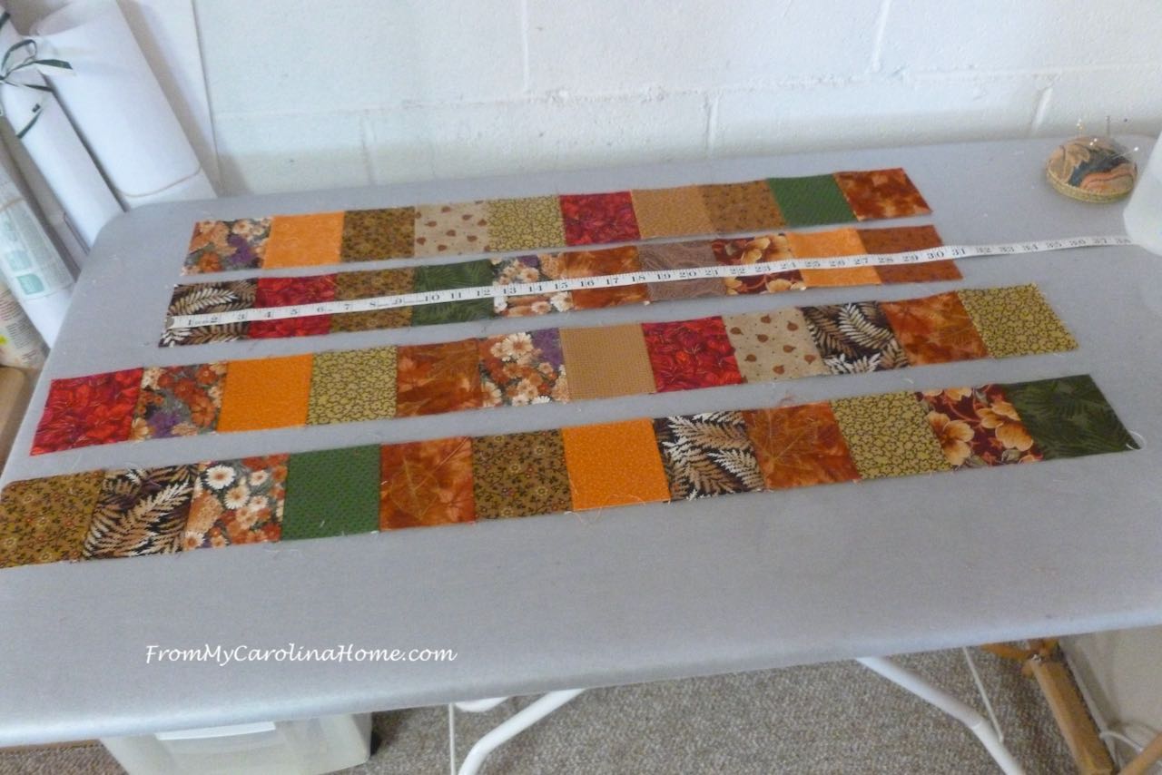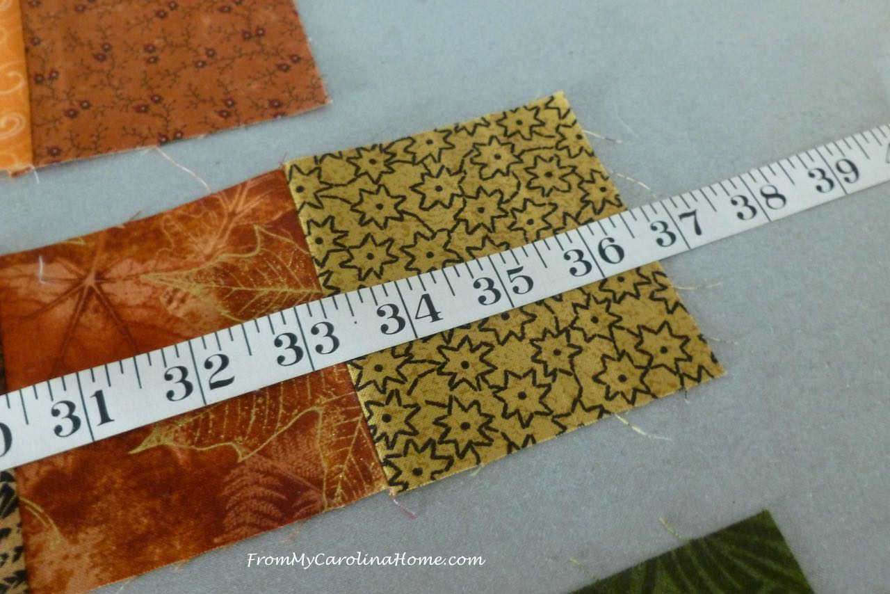 Using the scrappy 3-1/2 inch squares, make four borders. Two of the borders will have 10 squares each, and the other two will have 12 squares each.