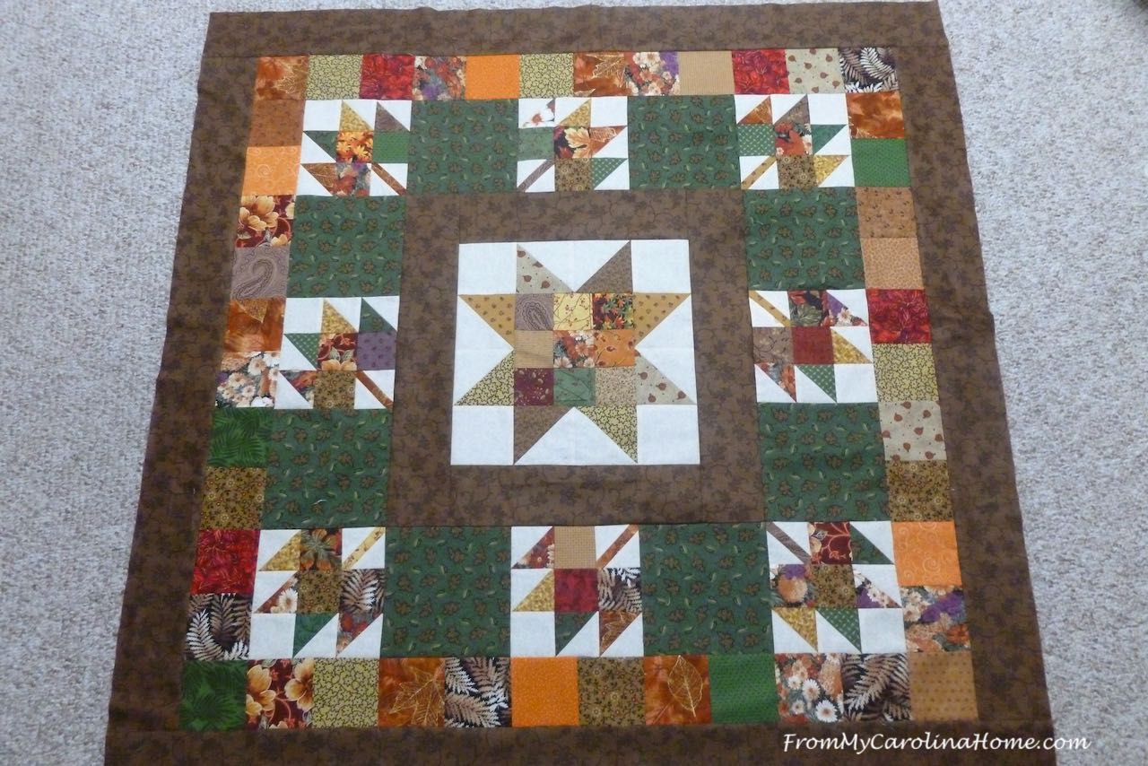 I love this quilt. The fabric colors make me feel all warm and cozy. I love the multi-fabric border.