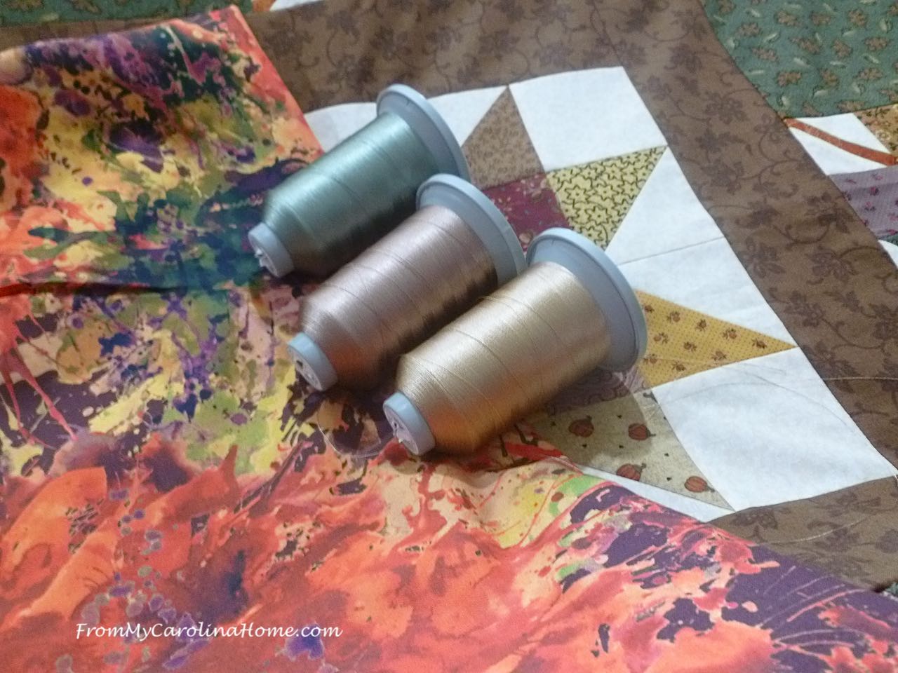 Here’s your pdf for your sewing room – Autumn Jubilee Quilt Along Assembly. Next Friday, we’ll finish up with quilting and binding. I auditioned thread colors in anticipation for that step. The middle one worked well for both the top and this bright backing.