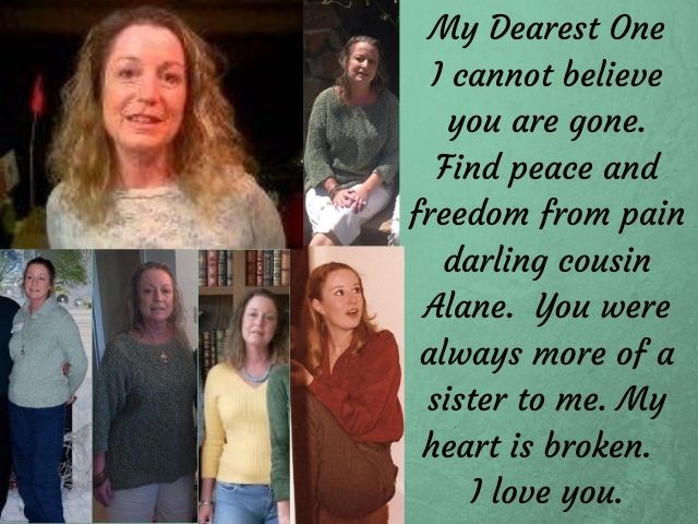 So very sorry for your loss of your dear cousin/friend/sister. May Alane rest in peace. Prayers and condolence to you and the family.