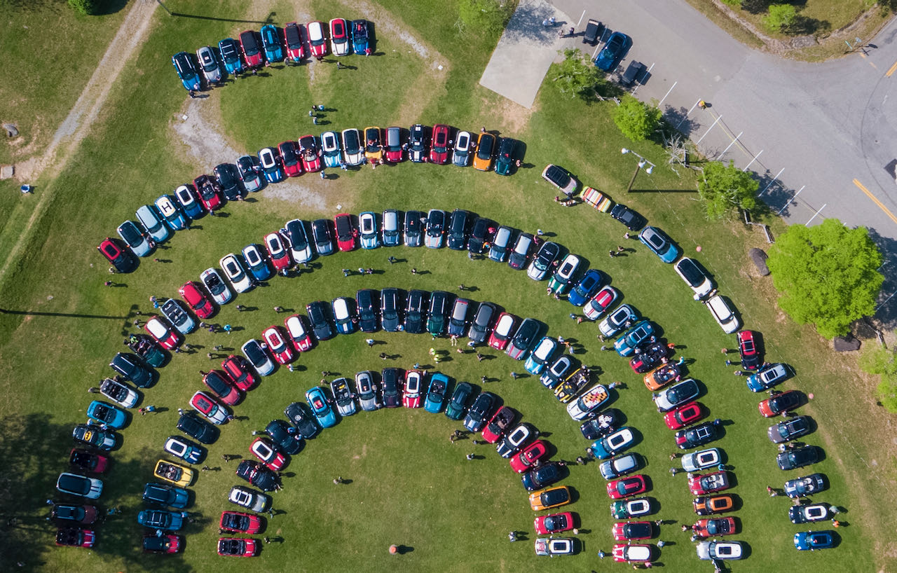 The panoramic photos were taken by photographer Killboy.com with drones from high overhead. You’ll notice some cars appear to have white squares on their tops, most are a white top with a sunroof. First an overhead drone shot of all the cars as parked was taken.