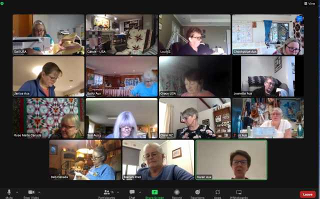 One reason I got this little quilt done so fast was a virtual sew day with ChookyBlue. When I joined the Zoom, there were 15 bloggers on the call. This is still amazing, to have quilters with common interests from Australia, New Zealand, Canada and the USA all at the same time. For a bit we had a quilter from Norway and one from Germany on as well! For Chooky, our host, it was 6 am in the morning when she started the call. For me, it was 4 in the afternoon. We chatted about so many things, from blogging vs Instagram, to rhubarb pie. Chatting and sewing, I got a lot done in the hours I was able to join in.