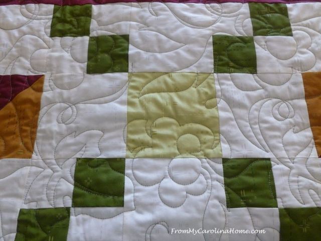 I called the quilt Vineyard, and the magazine used my quote for the explanation of quilting with a grapevine pantograph. The pantograph is Vineyard designed by Lisa Thiessen of Threadsongs for Willow Leaf Studio. The thread is sage green Glide, with Bottom Line in the bobbin, and Hobbs 80/20 Batting.