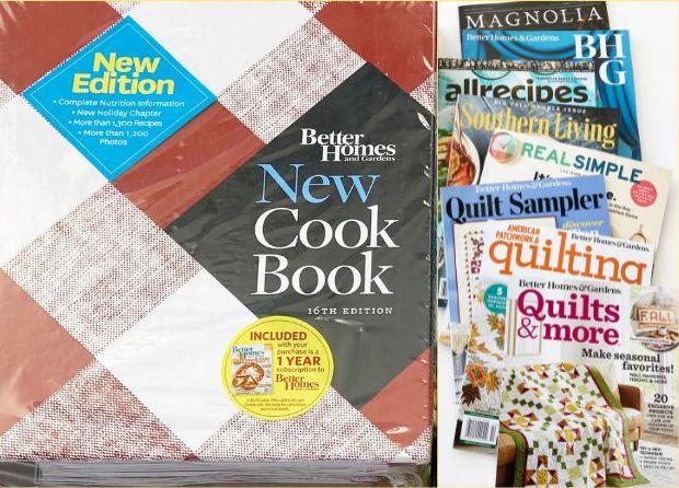 Today’s giveaway is sponsored by Meredith Publishing, now known as Dot Dash, publishers of some of our favorite magazines like Quilts and More, Better Homes and Gardens, Southern Living, All Recipes, American Patchwork and Quilting, Real Simple, Magnolia, Quilt Sampler, and the New Edition of Better Homes and Gardens New Cookbook. The prize is the cookbook, plus one issue of all the magazines you see in the photo, including the one with my pattern, Autumn Elegance, on the cover.