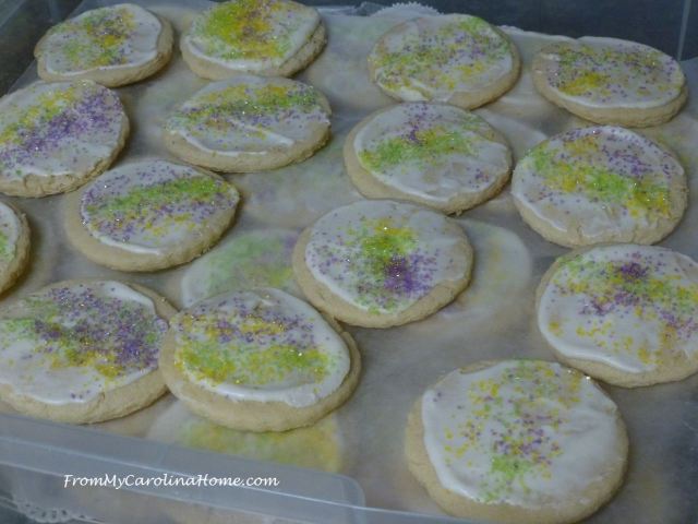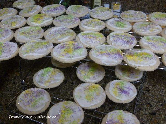 For fun, I made some Vanilla Sugar Cookies with Mardi Gras sprinkles to take to our pickleball group this morning. A couple of the guys had been grousing (playfully teasing me) that they didn’t get cookies for Valentine’s Day. So, on Sunday I mixed the dough and put it in the refrigerator overnight. Then, yesterday, I did some baking. I am trying a new recipe for the icing. My Sweet Babboo isn’t fond of the royal icing I usually use, so this time I found one that has butter in it, but claims to harden just enough to stack the cookies. We’ll see. I frosted them, added the sprinkles, and let them dry for about 3 hours while I sewed.