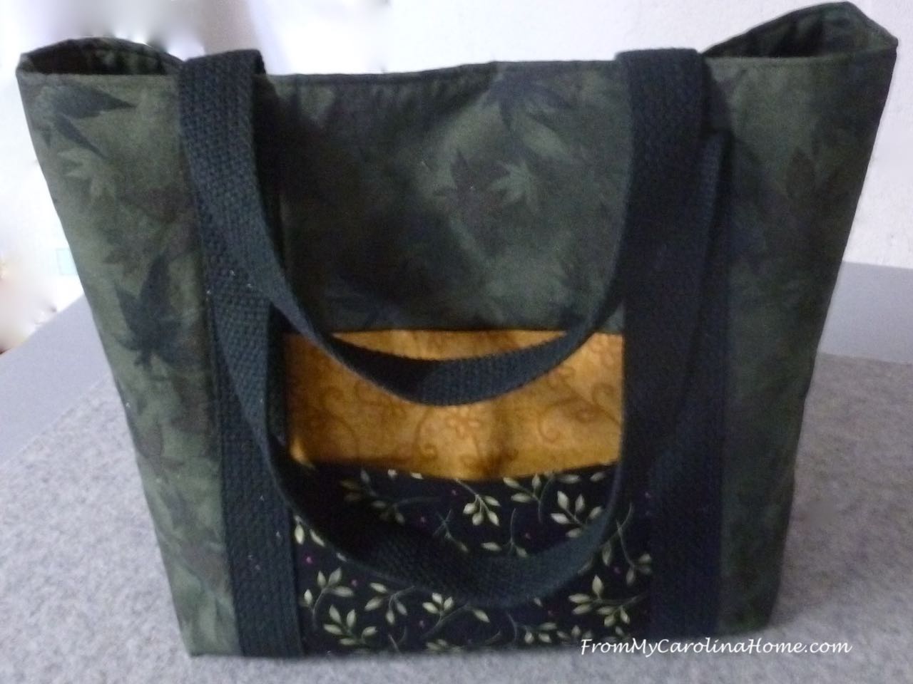 Autumn Jubilee bag, velcro closure suitable for a purse or lunch carrier, or supplies for retreat. Two pockets both front and back, same on both sides, web handle. Interfaced between layers for stability. 10 inches high x 10 inches wide x 4 inches deep. $20 plus shipping SOLD