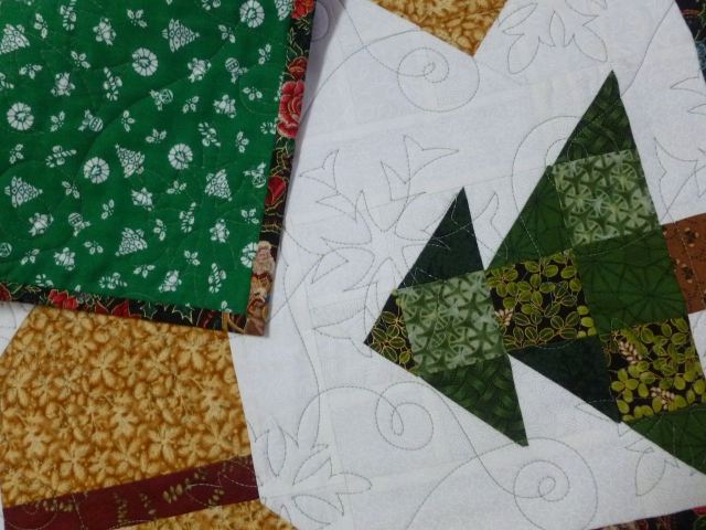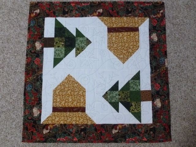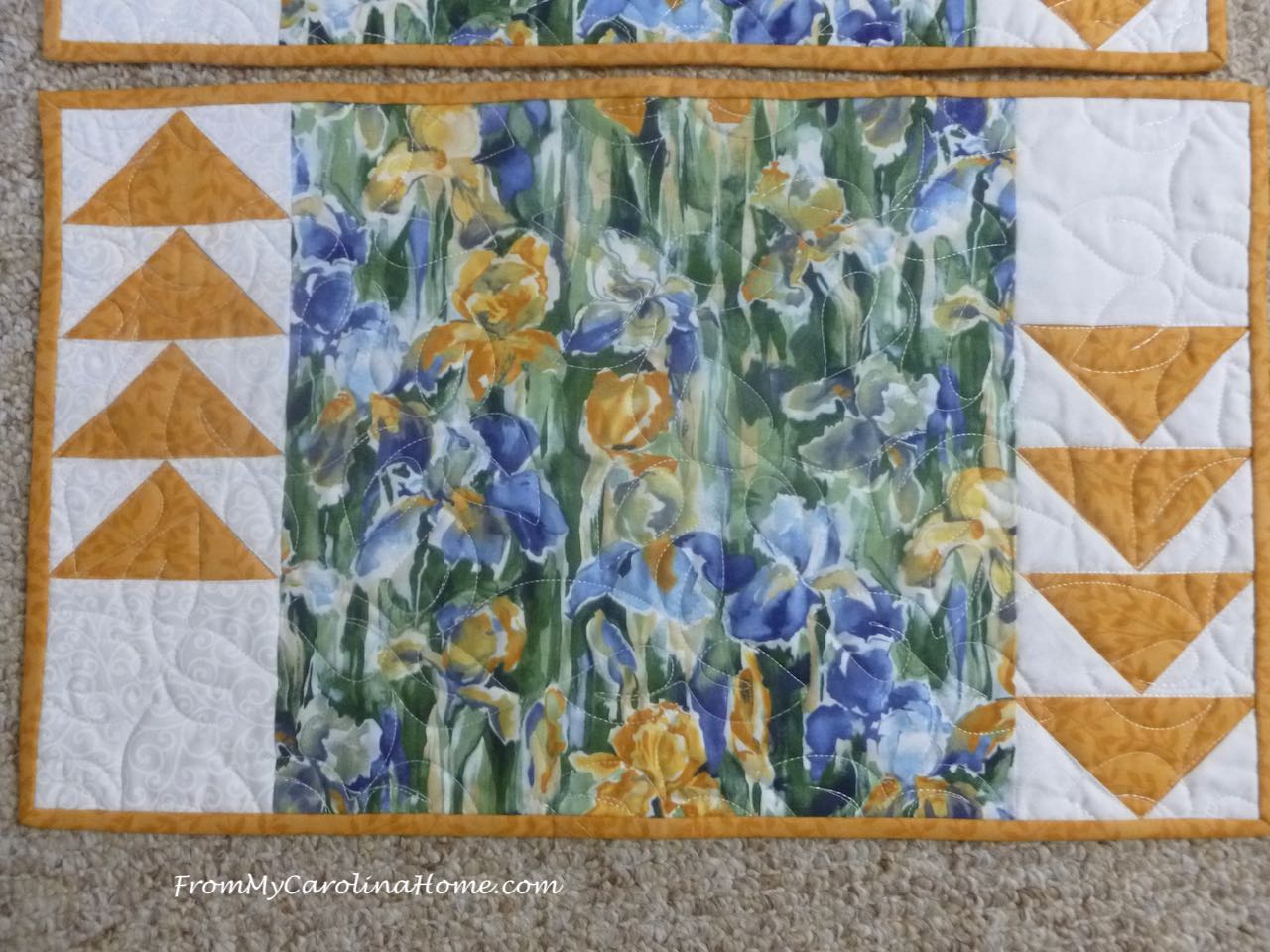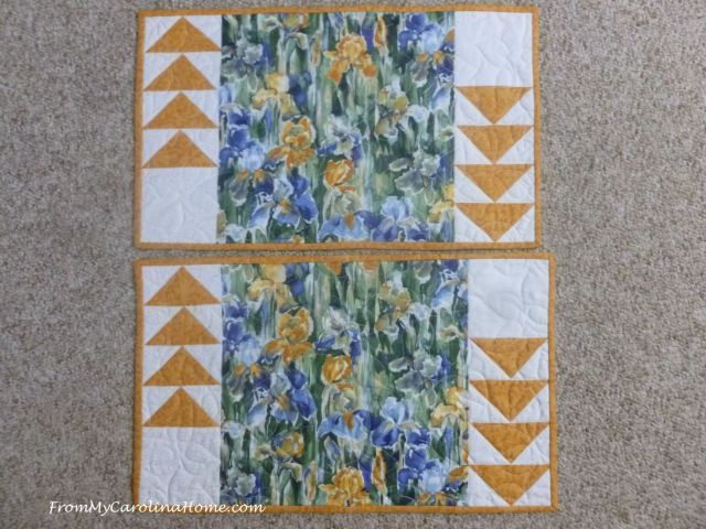 Set of 2 Iris Placemats with flying geese accents in blue, green and gold. Generous size at 12 x 20 inches. Quilted in white with a leaf pantograph. $25 plus shipping. SOLD