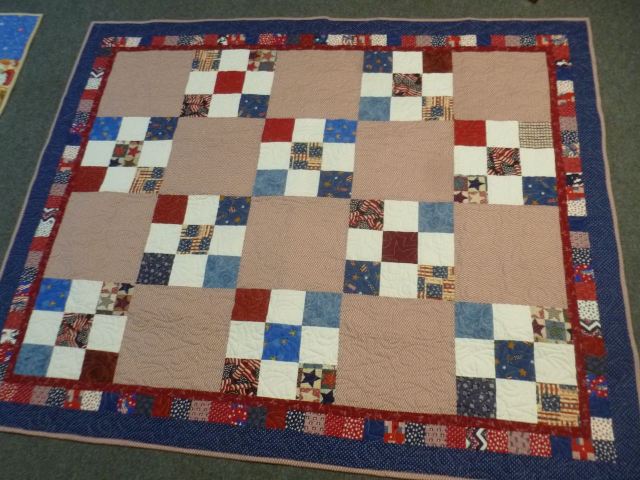 Patriotic Lap Quilt – Nine patches alternate with subtle red print and a scrappy border surrounded with navy and bound in the same red print. Pantograph quilting with a star design. 60 x 72 – $125 plus shipping.