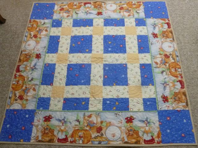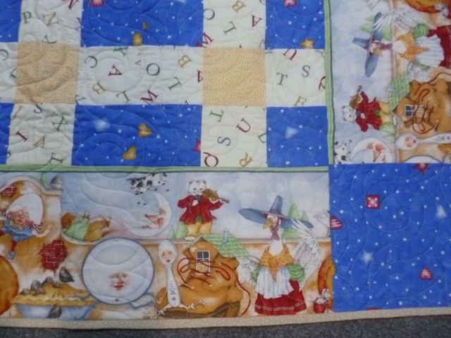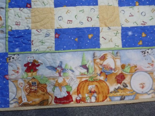 Mother Goose Play Quilt – Larger size of 54 x 54 is suitable for a play mat or cuddling by a young child. Fun I Spy game quilt, too. Sweet Mother Goose print borders with pieced center, cotton batting, pantograph quilting- $65 plus shipping SOLD