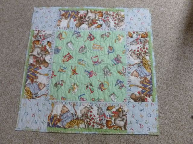 Hungry Animals Lullaby quilt – 34 x 34 inches square, pantograph quilted with a cloud design, cotton batting. Fun for I Spy games, and word games by letter, like Pig and Pajamas. – $45 plus shipping SOLD