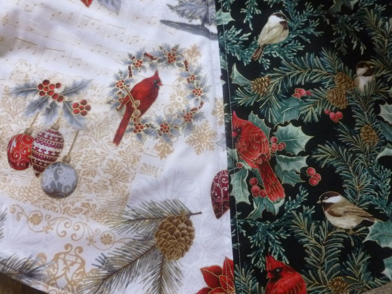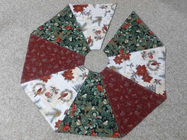 Christmas Tree Skirt – eight gored octagonal skirt, overlaps when placed around a tree base. Cotton batting, stitched on either side of the seams leaving the centers unquilted. Skirt measures 39 inches side to side along the straight edges laid flat. $30 plus shipping SOLD