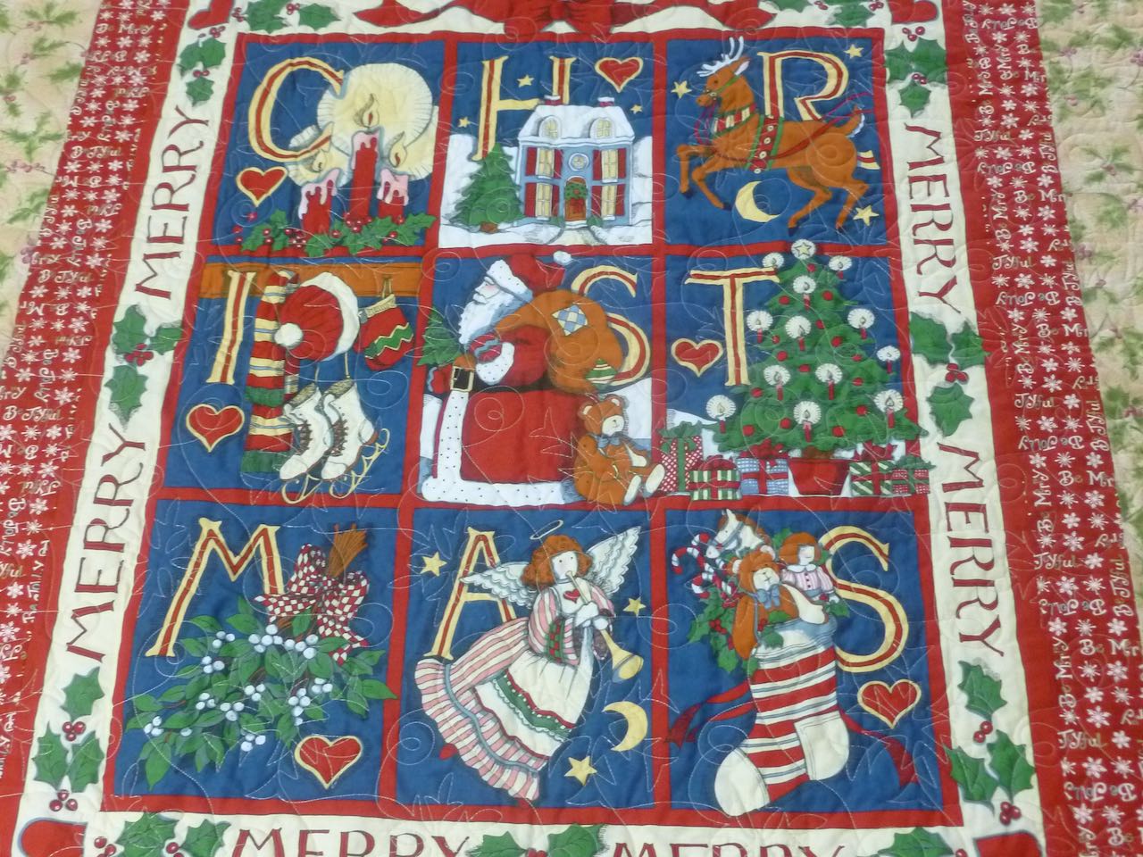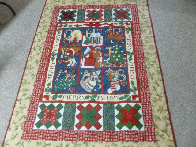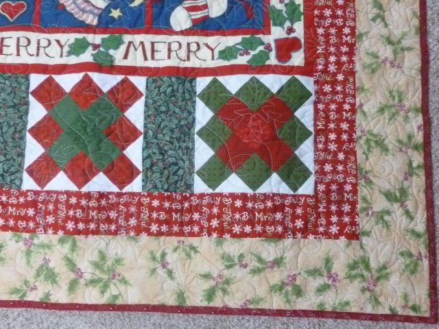 Merry Christmas throw quilt, 48 x 69 inches. Center panel with six pieced blocks with holiday print borders. Cotton batting, pantograph quilting with a snowflake design. $45 plus shipping. SOLD