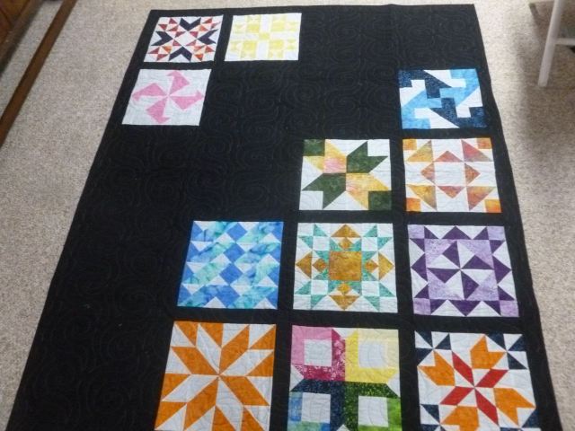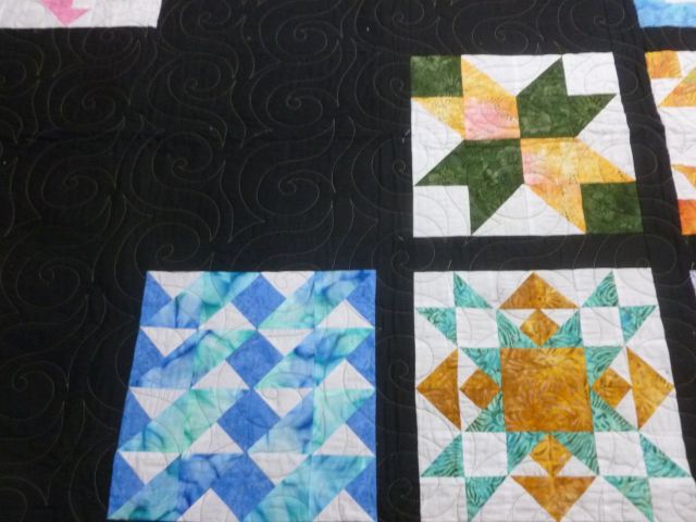 Midnight Magic, made in 2015 never used. Batik traditional blocks on a black background with taupe thread quilting. Modern setting. Cotton batting. 56 x 70 inches, suitable for bed or wall hanging, or just cuddling. $75 plus shipping.