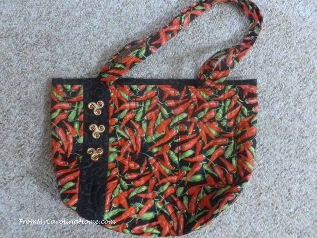 Chili Pepper Purse with black accent and buttons, two pockets inside, velcro closure, 15 inches wide x 11 inches tall with boxed bottom corners. Fabric handles. Comes with matching sunglasses case. $20 plus shipping. SOLD