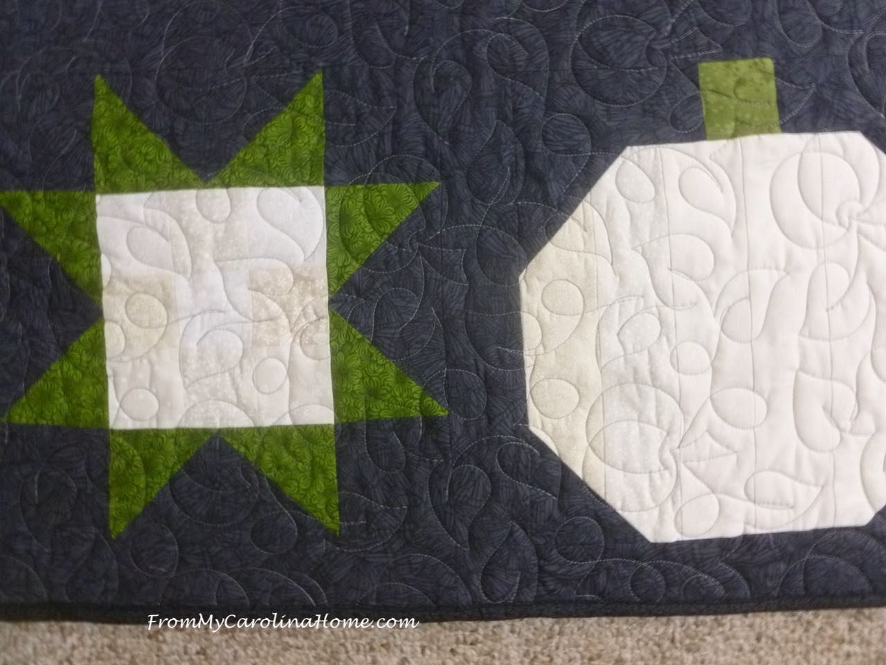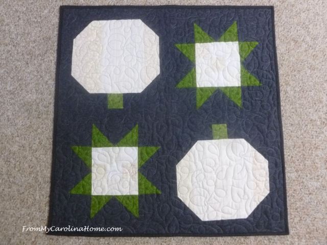 White Pumpkin Table Topper – Pieced white and green on slate grey background, quilted with leaves and pumpkins, 29 x 29 inches square. $35 plus shipping.