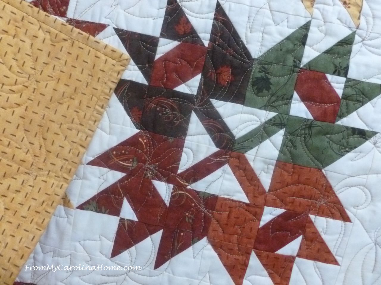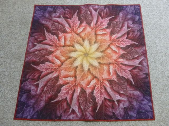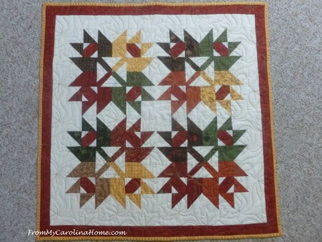 Maple Star Table Topper – made for a Moda Bake Shop pattern with high quality Moda fabrics and published on their website. Quilted in taupe with a maple leaf pantograph. Size 30 x 30 inches square. Cotton batting. – $60 plus shipping