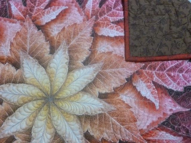 Dream Big Leaf Panel, custom quilted with taupe Glide thread with patterns defining the leaves. Wool batting, dark brown backing, 46-inches square. $45 plus shipping.