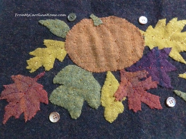 Autumn Wool Table Runner – All hand stitched wool applique on brown wool base with wool threads, glass seed bead and button embellishments. Gold color backing is cotton felt- 16-1/2 x 24-1/2 – $45 plus shipping. SOLD