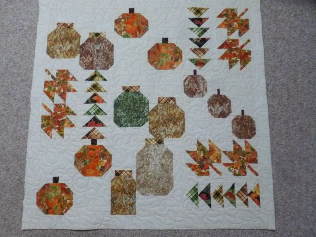 When I put mine together, I got the pumpkin blocks swapped and didn’t notice this until it was quilted. Here is mine. The top is 40-inches square with 12-inch finished blocks and a 2-inch border of background. I like this, but the pumpkins on the lower left should be swapped with the middle top so that the flying geese don’t come off the pumpkin stem.