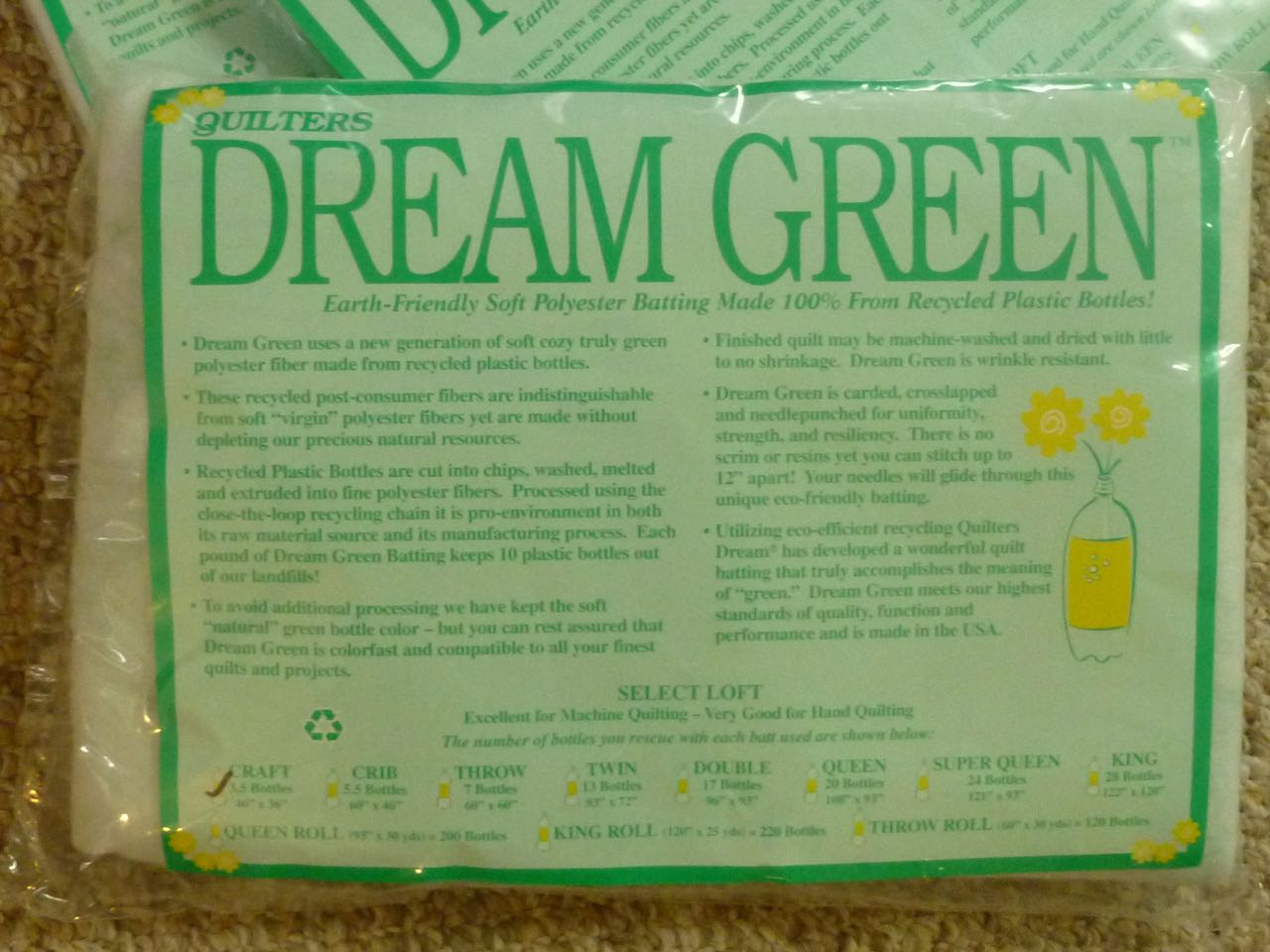 Consider recycled batting in your quilts like Quilter’s Dream Green. Using products like this, made from 100% recycled materials, increases the market for recycled material goods so more can be re-used instead of making more plastic. This batting is a joy to use, quilts beautifully, and doesn’t shrink. Every pound of Dream Green takes TEN plastic bottles out of our landfills! The soft green color is from natural processing without harsh bleach, does not show through fabrics, and can be quilted with stitching lines 12-inches apart. It is available at many quilt shops, and through my affiliate link. Make a queen size quilt, and it takes 20 bottles out of the landfill. How many could we recycle if every person reading this post did just one quilt this year with Dream Green? Thousands!! Now, that is real impact.