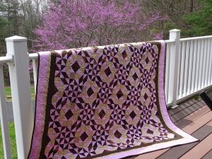 “To The Nines” is an English idiom meaning “to perfection” or “to the highest degree” or to dress “buoyantly and high class” (Wikipedia). The name reflects the two sizes of nine-patches used in the quilt design. Pattern has three sizes (throw, twin and full size) appropriate for Quilts of Valor, and two options for color placement.