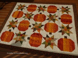 Pumpkin Star is an Autumn inspired pattern, and features pumpkins and stars in seasonal beauty. Pattern contains cutting and construction instructions for 20 blocks. This pattern uses up your scraps, and does not have yardage (updated, see paragraph below for approximate needs). Instead, it has cutting for the scrap squares or rectangles and background squares needed. Pull from your scrap saver systems, or cut up leftovers to get the required pieces. The quilt dimensions are given as an oversize throw (48 x 60) with ideas for table runners, along with a bonus worksheet and block table so you can make whatever size you like. The pattern assumes a knowledge of making half square triangles and basic assembly. Make your pumpkins orange, or gold, or any color you choose. The stars are designed to use up your Autumn color scraps. Your scraps cost the same as your cut pieces, so use them up in a creative way. This pattern can be made from the bits left over from other projects, and a scrappy border uses up even more.